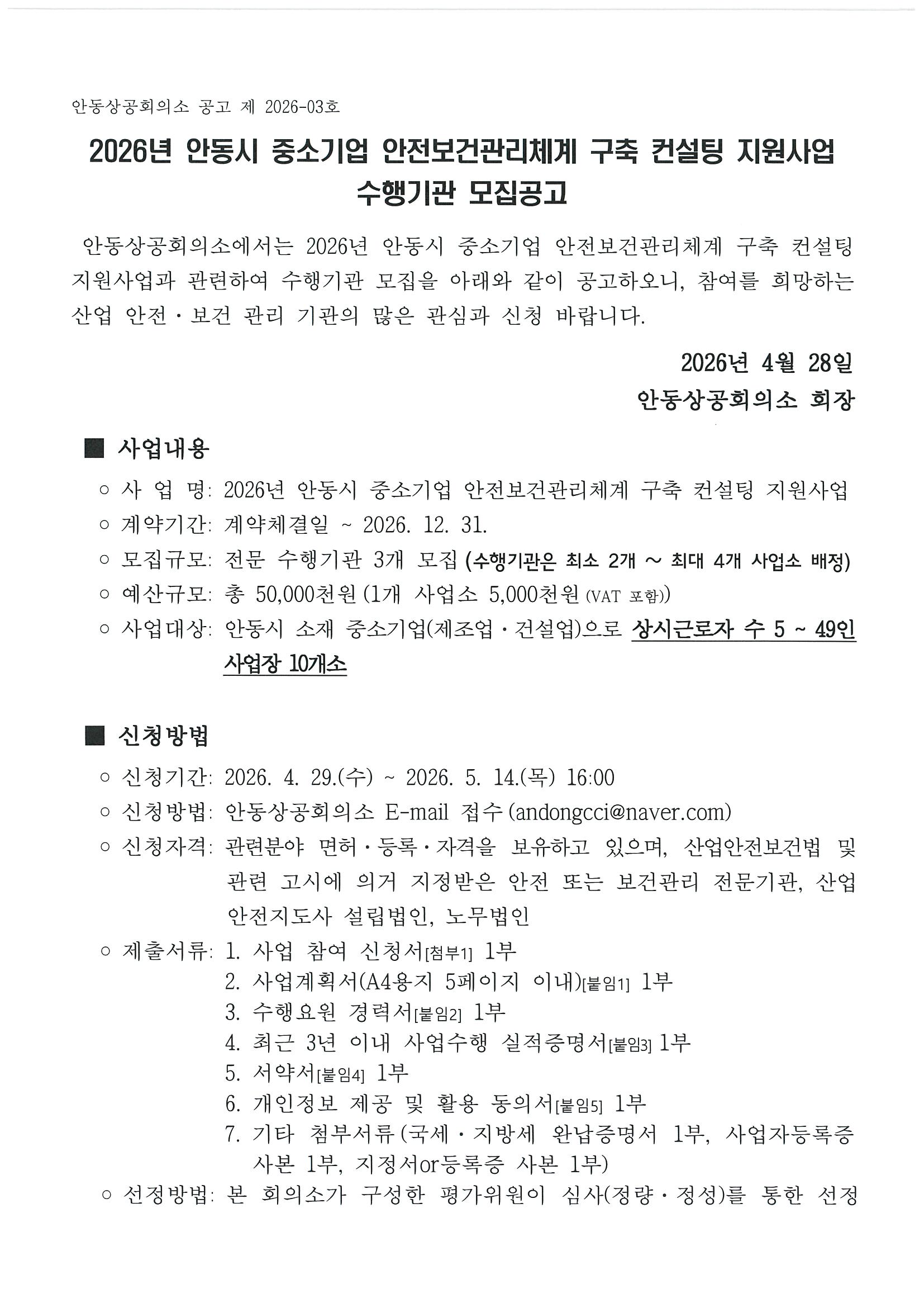 | 제목 | [안동상공회의소][공고]2026년 안동시 중소기업 안전보건관리체계 구축 컨설팅 지원사업 수행기관 모집공고 | ||