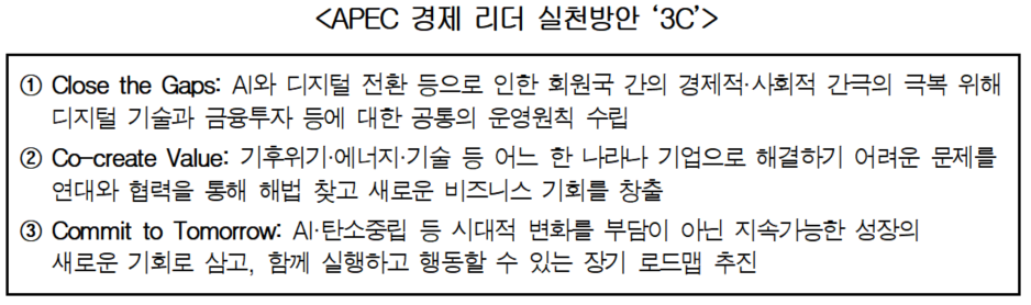 APEC 경제 리더, ‘AI 격차 해소’ 등 실천방안 제시  - 최태원 회장, 3C 제안 : ①격차 해소(Close the Gaps), ②협력 가치 창출(Co-create Value), ③미래 실천약속(Commit to Tomorrow) - ‘APEC CEO 서밋’ 대단원 막 내려 ... 차기 개최국 中 CCPIT 런 홍빈 회장께 의사봉 전달