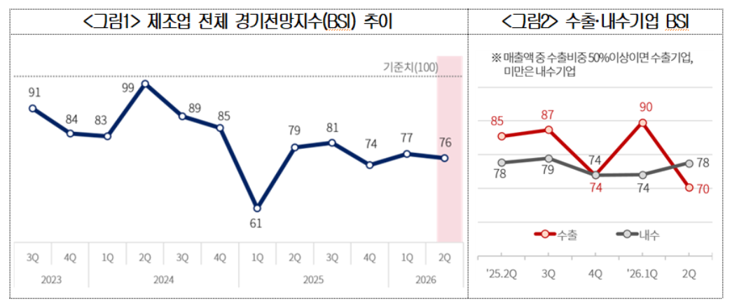 반도체 경기 호조에도 불구하고 중동사태에 따른 공급망 불안 심리로 2분기 제조업 경기전망지수는 소폭 하락한 76으로 나타났다. 대한상공회의소(회장 최태원)가 3월 18일까지 전국 2,271개 제조기업을 대상으로 ‘2026년 2분기 기업경기전망지수(BSI)’를 조사한 결과, 2분기 전망치는 직전분기 대비 1p 하락한 ‘76’으로 집계됐다. 부문별로 보면 내수기업 지수는 78로 전분기 대비 4p 상승했고, 중동사태와 같은 대외 리스크가 겹치며 수출기업 지수는 70으로 전분기 대비 20p 하락했다.