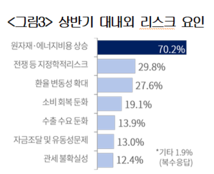 상반기 대내외 리스크는 '원자재·에너지 비용 상승'(70%), '전쟁 등 지정학 리스크'(30%) 順