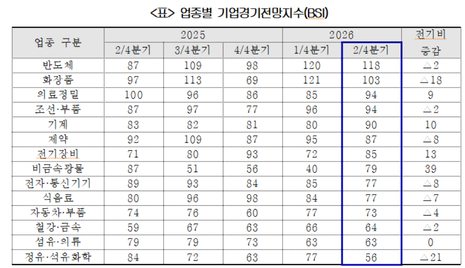 전체 조사대상 업종 중 ‘반도체’, ‘화장품’ 업종은 기준치 100을 넘으며 2분기 경기가 개선될 것으로 전망했다. 글로벌 AI 인프라 투자 확대에 따라 호황을 맞은 반도체(118) 업종은 2분기 연속 긍정적 전망이 우세했다. 화장품(103)은 전분기 대비 18p 하락했으나 여전히 경기 개선 전망이 우세한 것으로 나타났다.