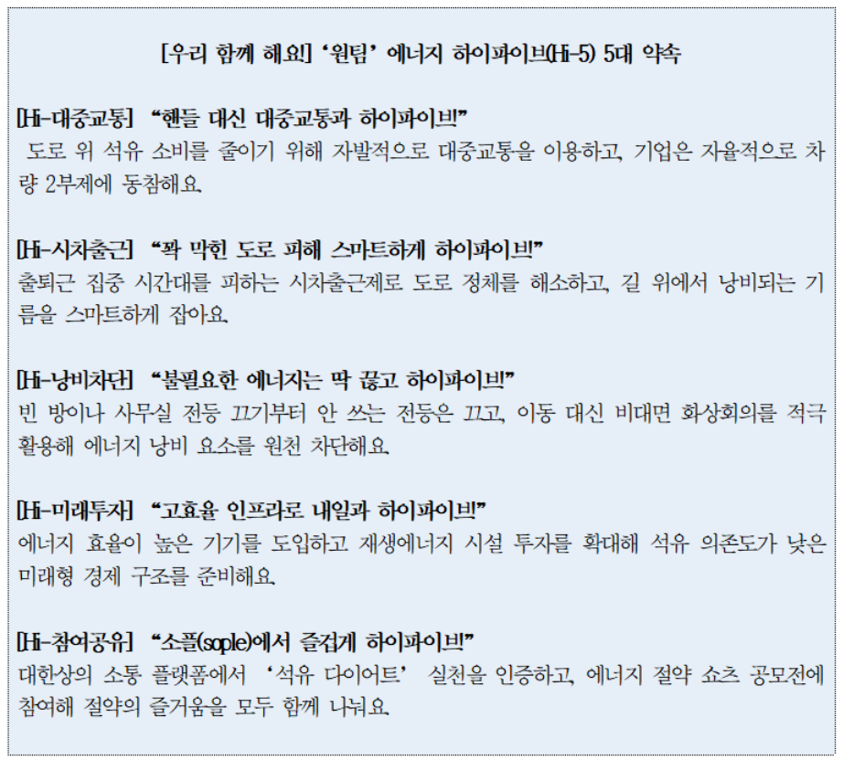 "기업-시민사회, 에너지 하이파이브(Hi-5)로 뭉쳤다!" - 대한상의-에너지시민연대, 석유 수급 위기 돌파 위한 '에너지 하이파이브(Hi-5)' 캠페인 런칭 - '기업-시민 원팀' 되어 ... 대중교통·시차출근·전등끄기 등 5대 실천약속 전파 - 상의 소플(sople) 통한 '석유 다이어트' 인증, '쇼츠 공모전' 까지 중동발 에너지 수급 불안으로 국가 경제에 비상등이 켜진 가운데, 경제계와 시민사회가 석유 소비 감축을 위해 손을 맞잡았다.